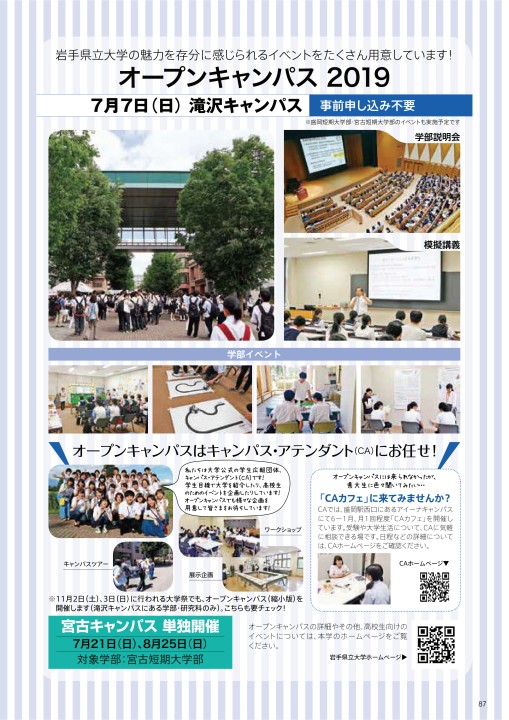 秋のオープンキャンパスを開催しました 17年10月24日 今年度も大学祭と同時開催の秋のオープンキャンパスにて、入試相談と学生によるよろず相談を行いました。 受験を間近に控えた高校3年生の方や、進路を検討中の方など、多くの方にお越しいただき大学院入試情報 令和3年度実施博士後期課程:一般選抜、推薦選抜、社会人特別選抜、外国人・帰国子女特別選抜(学生募集要項) オープンキャンパス 21WebOC特設ページを公デジタルオープンキャンパス21 21年もオープンキャンパスをwebで開催! 岩手県立大学の学部の特徴やカリキュラム、学生生活などの情報をデジタルでお届けします。 学部紹介動画、学生が制作した動画、caの動画など、動画を随時掲載します。